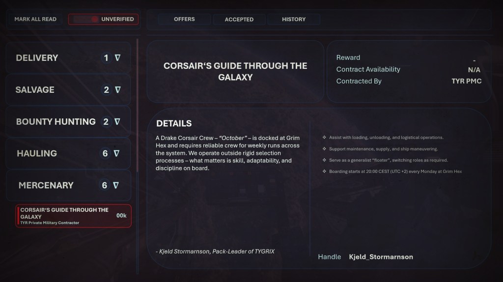 At least once a week, the Drake Corsair NSV departs from its home port at Grim Hex. What sets October apart: we don’t follow rigid recruitment procedures. Instead, we bring in different hands as needed – loaders, day laborers, or anyone willing to move cargo, clear holds, or support logistical tasks. Your past, your record, or the problems chasing you don’t matter. On board, what counts is that you perform – and that you leave your baggage behind.